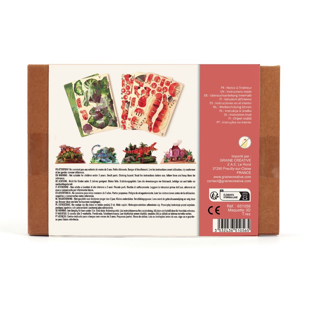 Easy to assemble, this 48-piece model of the tyrannosaurus also includes its decor for added realism. A creative activity for dinosaur fans and explorers in the making. Made from plywood sheets, parts click together—no glue or tools required.